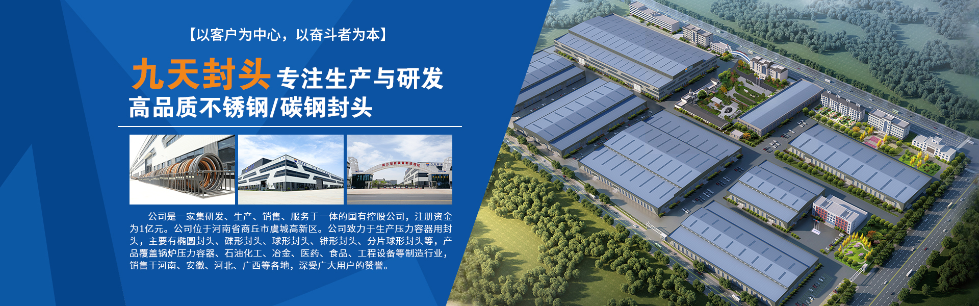 河南九天封頭制造有限公司是一家集研發、生產、銷售、服務于一體的國有控股公司,注冊資金為1億元。公司座落于河南省商丘市虞城縣高新技術開發區,南北相臨京九鐵路、濟廣高速,東西有連霍高速、隴海鐵路穿境而過,位置優越交通極為便利。 >> 了解更多